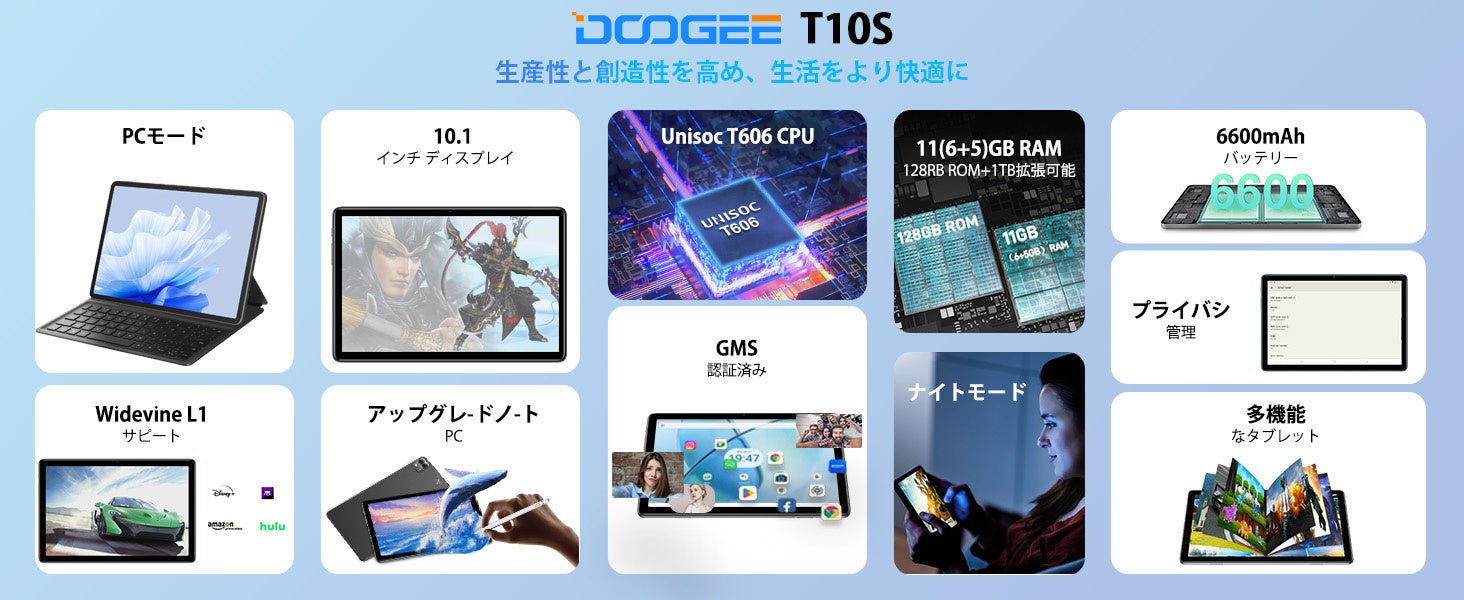 10.4インチ2000*1200解像度2K全視野角スクリーンで、ピクセル密度が高いため、より細部まで描写でき、よりシャープで鮮明な画像が得られます。DOOGEE T20 10インチandroid タブレットは、最大8GBのメモリ+最大7GBの拡張可能な仮想メモリ、合計15GBの融合メモリを搭載しています。これにより、タブレットは複数のアプリケーションを簡単かつスムーズに切り替えることができ、ラグをなくし、高速でスムーズな操作体験を提供します。