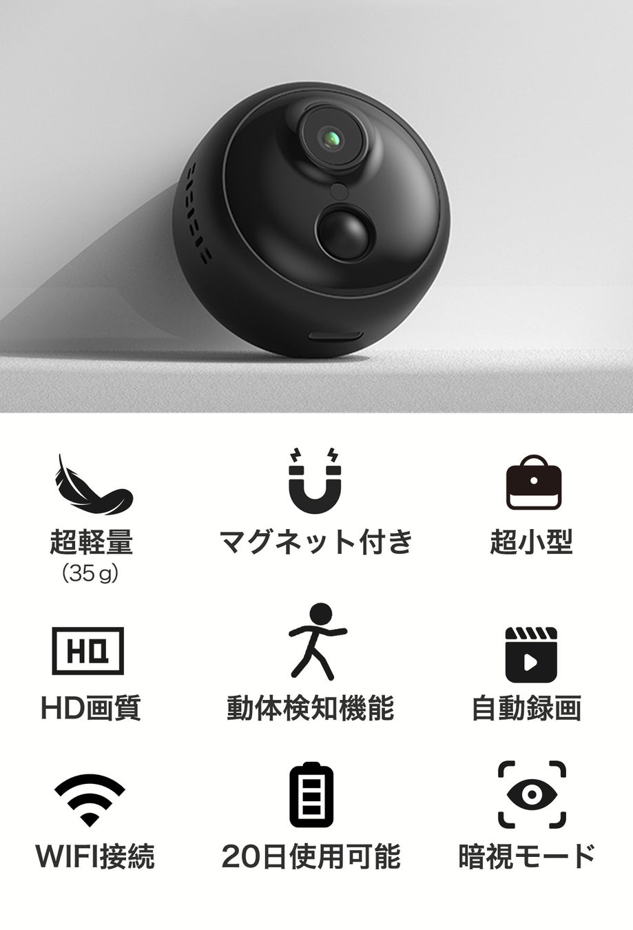 超小型・超コンパクト!狭い空間にも設置可能、設置場所が分かりにくい;ワイヤレス仕様で配線不要、マグネット付き、誰でもどこでも簡単に設置できます!動きを感知すると録画を開始、フル充電後20日の使用が可能