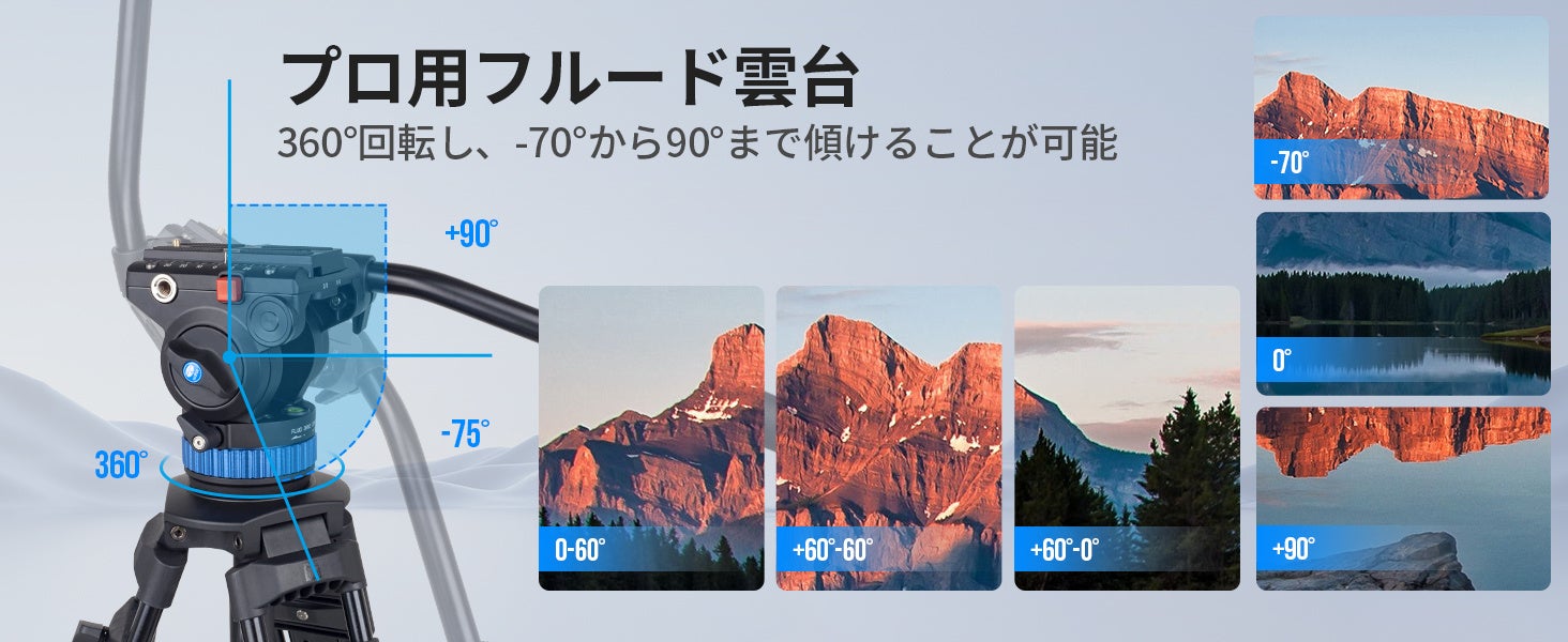【プロフェッショナルビデオ雲台】ダイナミックバランシングシステムにより、水平360°、垂直方向に-75°〜+90°の無段階移動が可能です。下部のリングは張力の量を調整できるため、頑丈な三脚が左から右にパンして、録音中のスムーズで安定した動きを実現します。