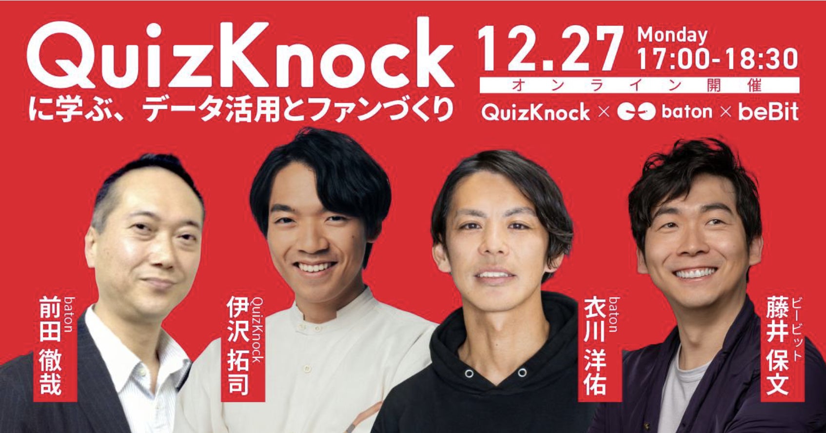 QuizKnockを運営する株式会社baton 代表 衣川洋佑が株式会社ビービット主催のオンラインセミナー「QuizKnockに学ぶ、データ活用とファンづくり」に登壇しました。株式会社batonからはマーケティング部部長 前田徹哉、株式会社QuizKnockからは伊沢拓司も登壇し、QuizKnockのデータ活用についてディスカッションを行いました。