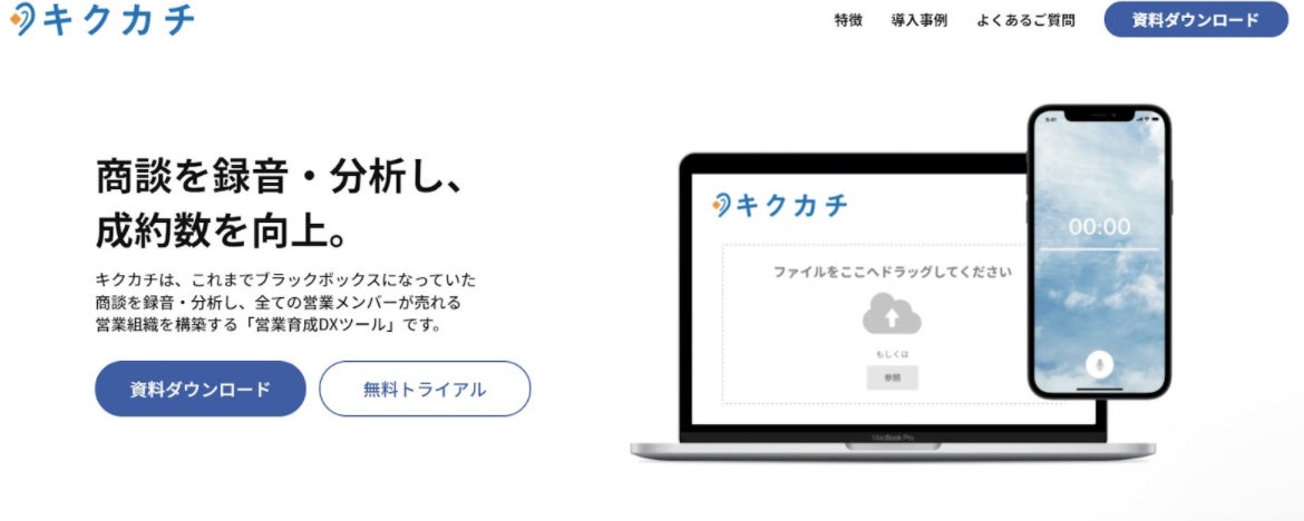 「キクカチ」はこれまでブラックボックスになっていた談を録音・分析し、全ての営業メンバーが売れる営業組織を構築する「営業育成DXツール」です。