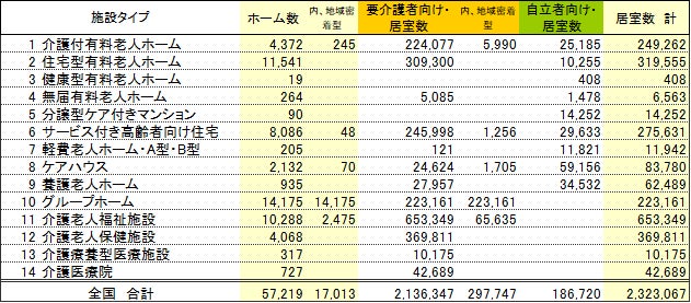 ・介護付有料老人ホーム 住宅型有料老人ホーム 分譲型ケア付きマンション サービス付き高齢者向け住宅 グループホーム 介護老人福祉施設(地域密着型含む) 老人保健施設 介護療養型医療施設 介護医療院 ほか