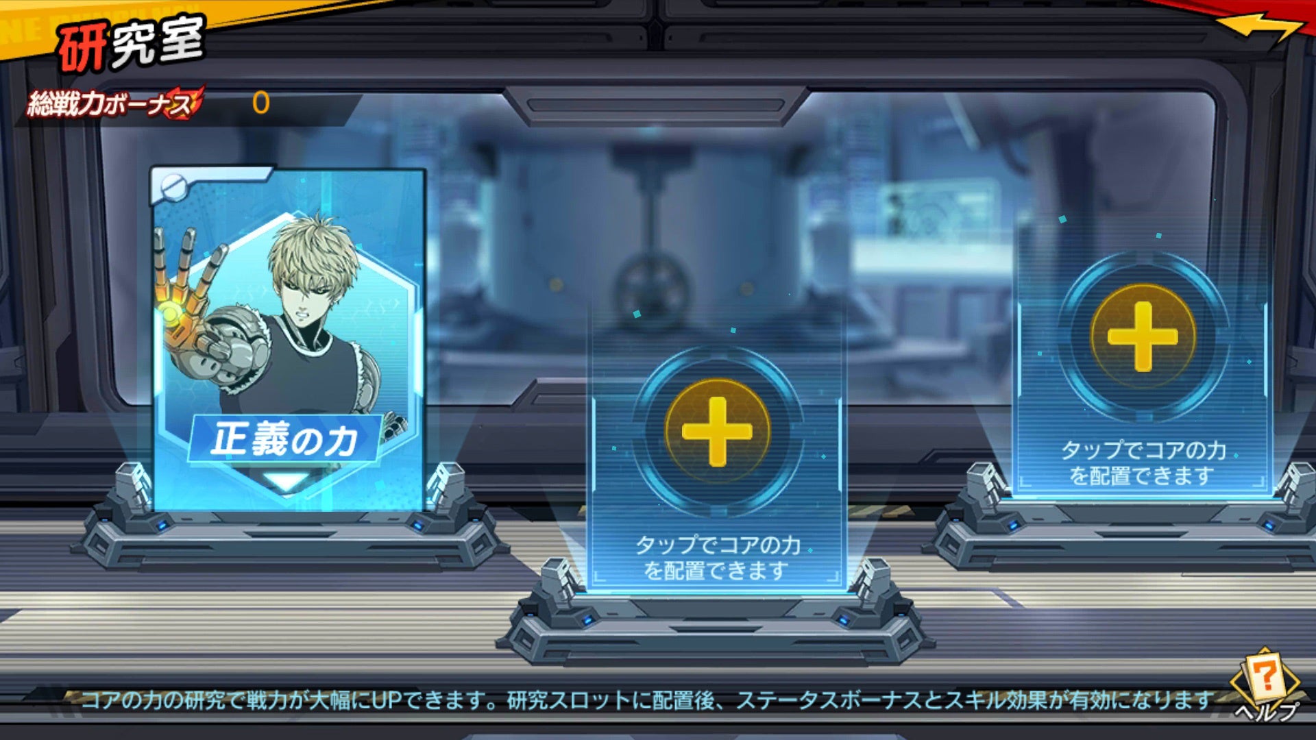 ルーム研究室は、コアの力(コアスキル)を強化できる機能です。プレイヤーLvに応じて最大3つまで研究スロットに配置することができ、編成全体へのステータスボーナスを受けることができます。強化に応じて効果もアップするので、ライバルに差をつけましょう。