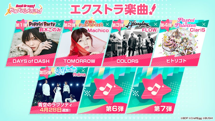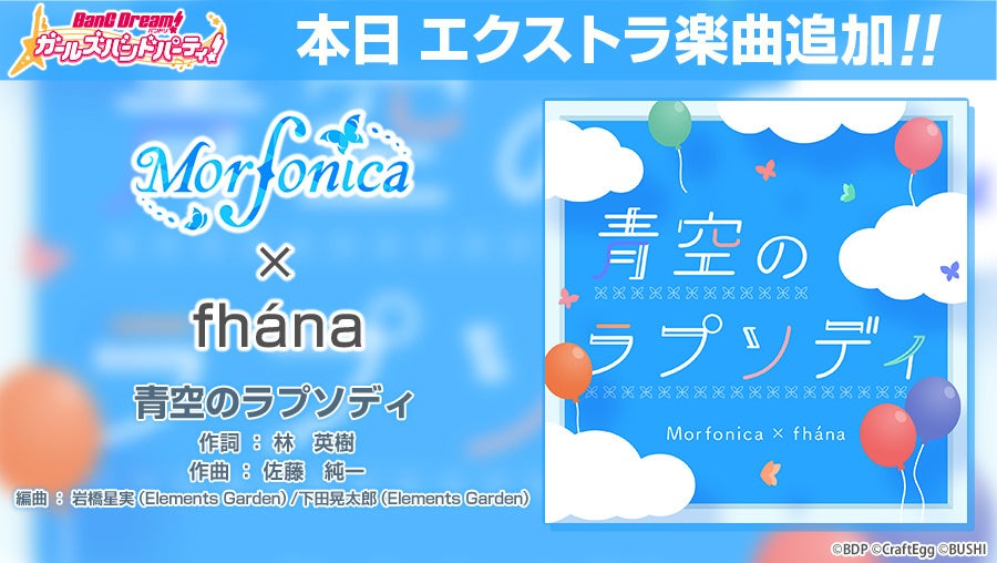株式会社Craft Egg(本社:東京都渋谷区 代表取締役:森川 修一、以下、Craft Egg)と、株式会社ブシロード(本社:東京都中野区 代表取締役社長:橋本 義賢、以下、ブシロード)の共同制作によるスマホゲーム「バンドリ! ガールズバンドパーティ!」(以下、ガルパ)は、2022年4月28日(木)より、エクストラ楽曲第5弾として、Morfonica(Vo.倉田ましろ/CV.進藤あまね)とfhánaさんが歌うエクストラ楽曲『青空のラプソディ』をゲーム内に追加いたしました。