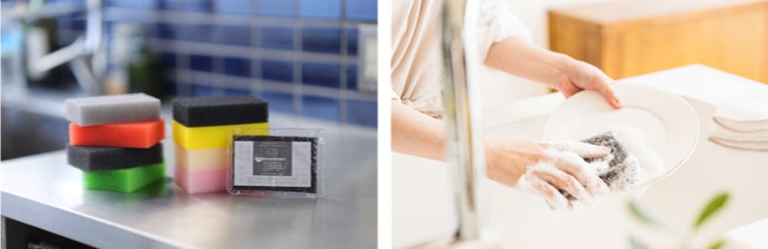 ダイニチ・コーポレーションは創業から、食器洗い用固形洗剤の製造販売を行っています。製造から販売を行う中で、固形洗剤と相性の良いスポンジを研究し、高品質ポリウレタンを使用した、従来のスポンジの概念を覆す「サンサンスポンジ」が生まれました。半年以上使えるほど丈夫で長持ちなので、ごみの削減に。