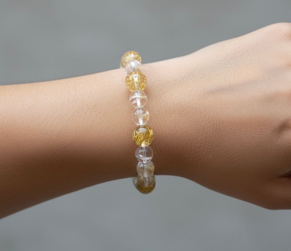 本商品は、2024年に宇宙を旅した「宇宙金箔玉」と、今回宇宙へ打ち上げを予定している「ルチルクオーツ玉」を組み合わせて誕生する、特別な腕輪です。