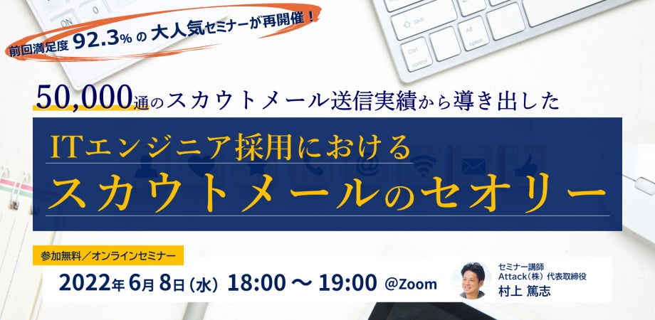 【大好評につき再開催】 前回満足度92.3%! <50,000通のスカウトメール送信実績>から導き出した「ITエンジニア採用におけるスカウトメールのセオリー」6/8(水)無料オンラインセミナー開催