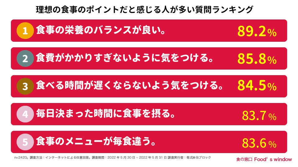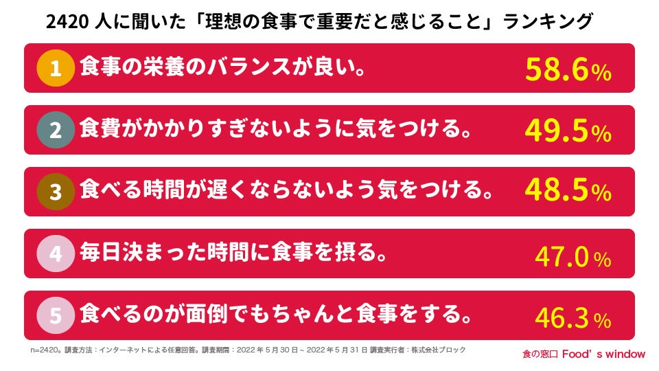 そこで、株式会社ブロックと一般社団法人 日本唐揚協会が共同運営している食の窓口(URL:https://karaage.ne.jp/contents/ )は、20歳〜59歳の男女2,420人を対象に「食事の悩み事と理想の食事についてのアンケート調査」を実施しました。