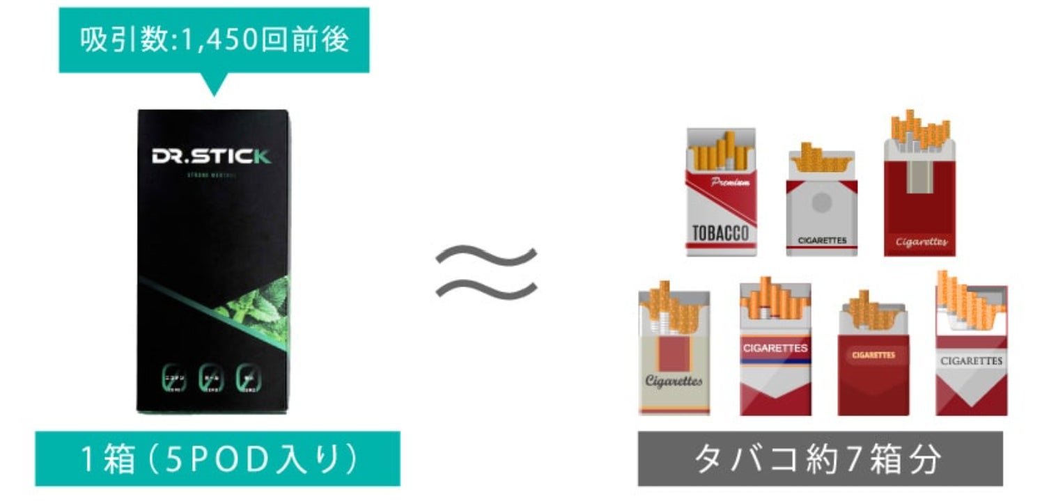 Dr.StickのPODは1箱でタバコ7箱分相当になり、タバコ税による値上がりもなく、コストパフォーマンスの良さに定評があります。