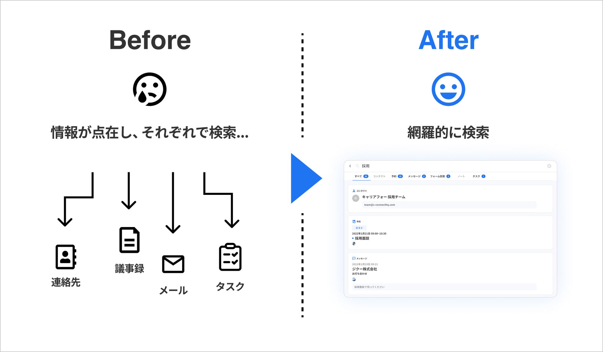 予定の参加者、議事録、メールのやりとり、フォーム回答、タスクの横断&一括検索を実現