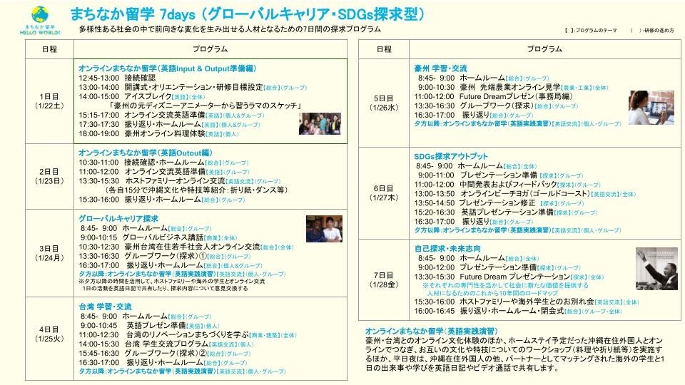 当プログラムは、沖縄県教育委員会の高校生向け留学事業の代替研修として採用され、オーストラリアと台湾に短期留学を予定していた沖縄県内の実業高校生40名を対象に1月22日(土)〜1月28日(日)に実施されました。