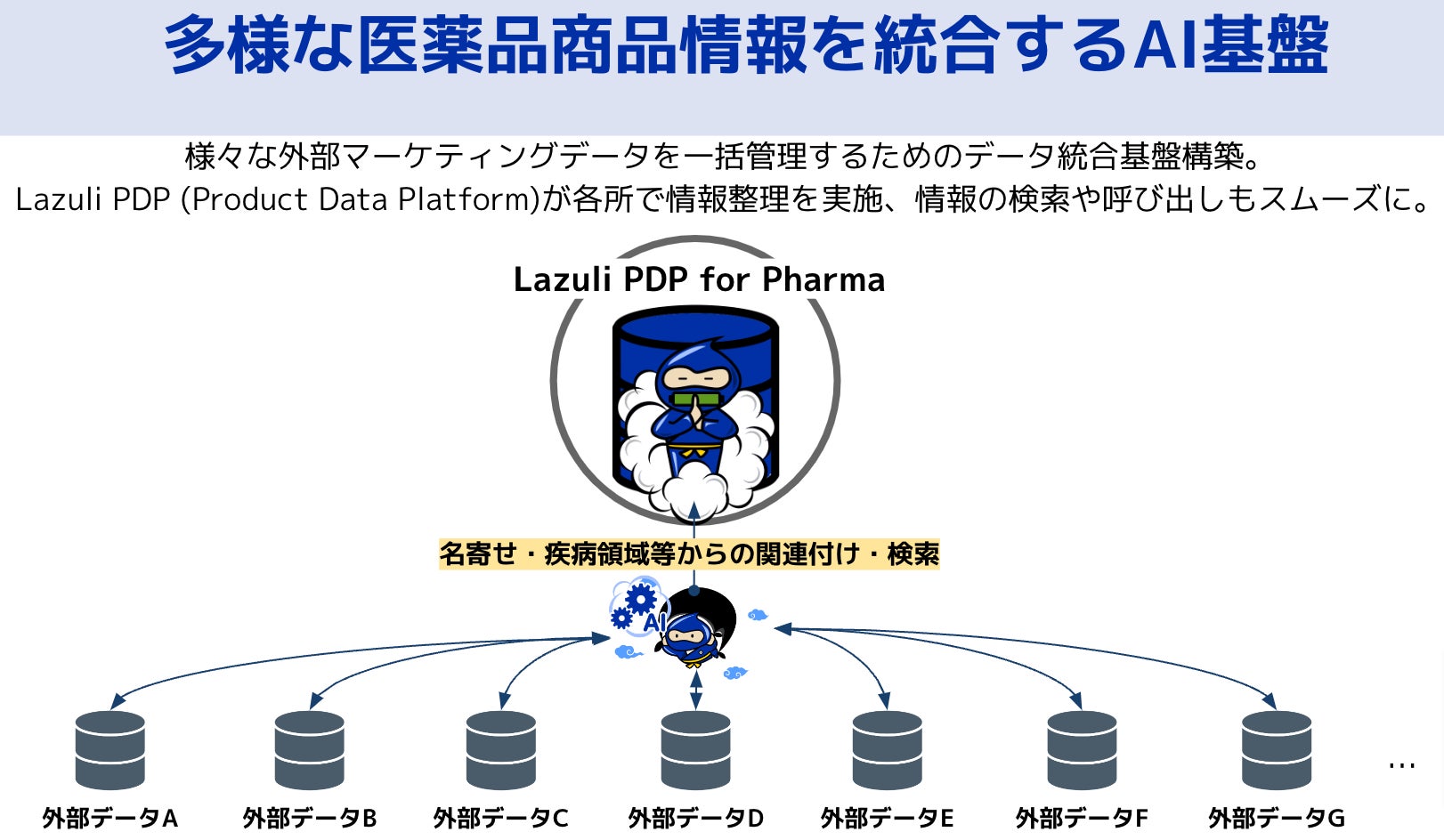 Lazuliが開発、提供する「Lazuli PDP」は、複数の外部データベースに点在していた商品情報を一括して管理し、またデータを活用しやすい形に整理、拡張するためのProduct Data Platformです。医薬品領域向けに、「Lazuli PDP for Pharma」 をリリースしており、AIをつかて医薬品の商品情報を統合する基盤としてユーザーに提供されています。