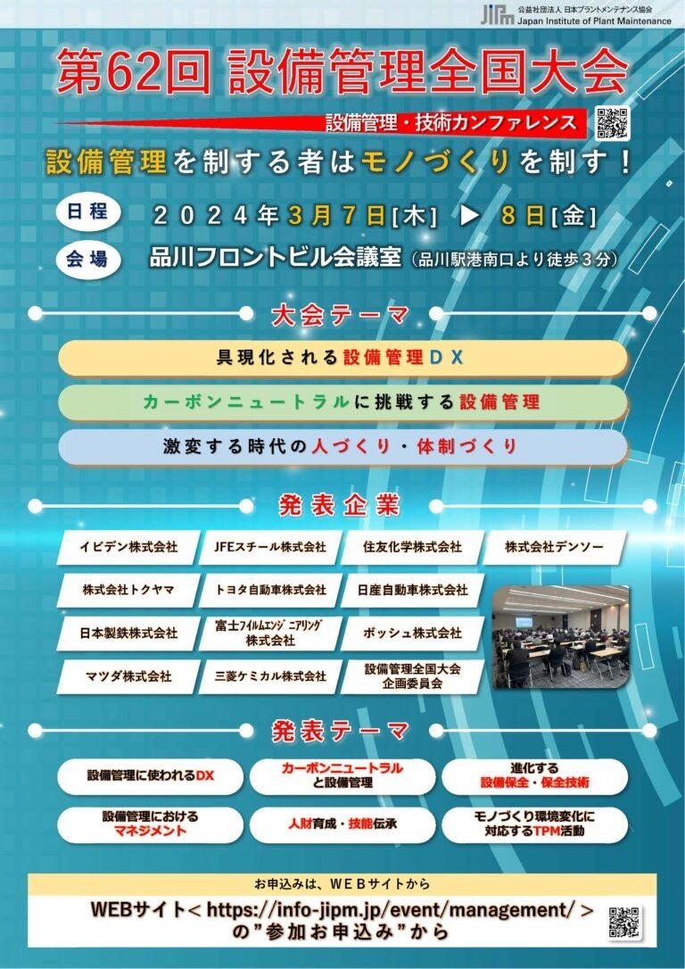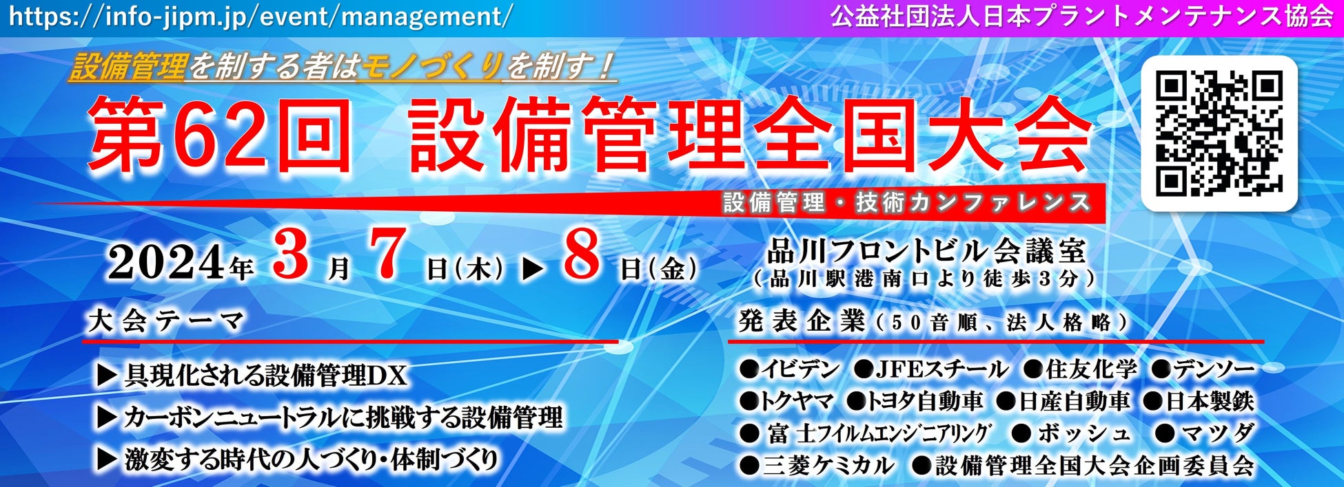 第62回 設備管理全国大会(設備管理・技術カンファレンス) 2024年3月7日(木)▶8日(金)品川フロントビル会議室(公益社団法人日本プラントメンテナンス協会)
