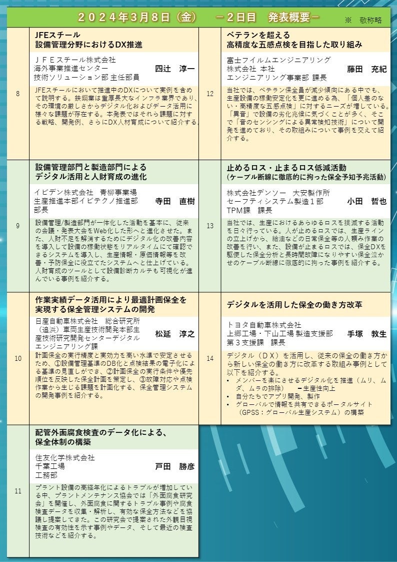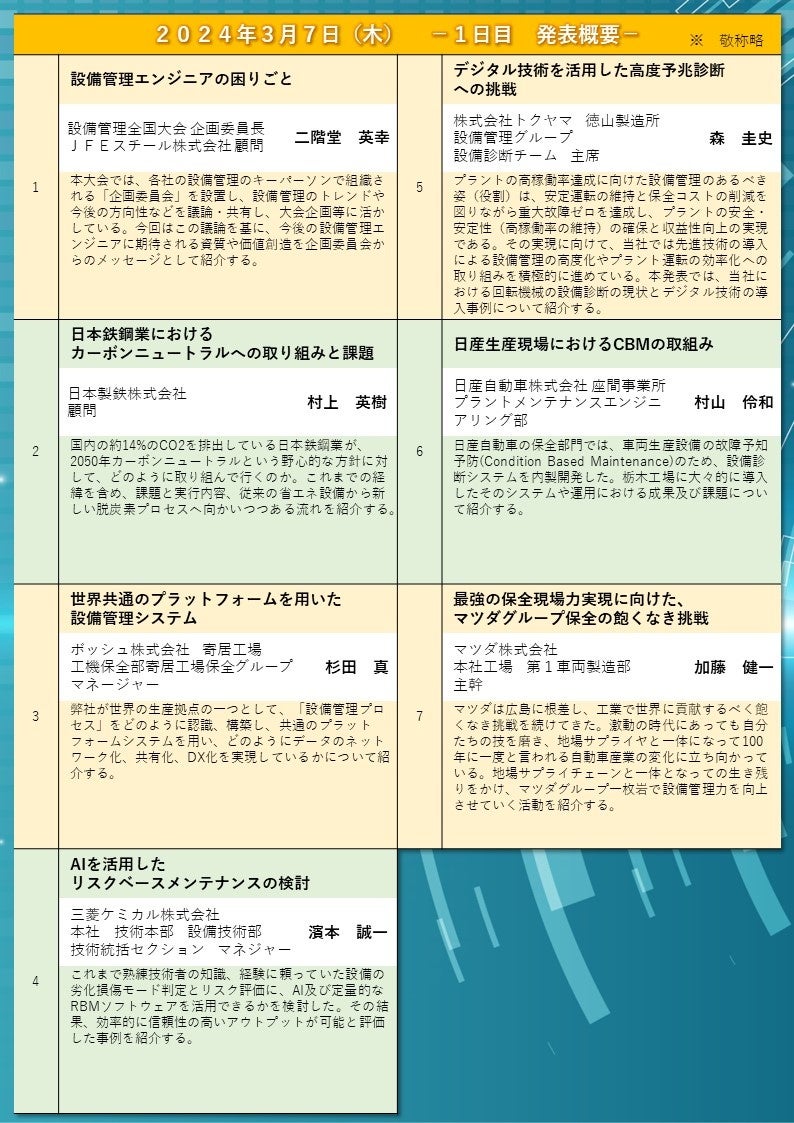 設備管理全国大会は、1961 年に我が国において初めて開催された本格的な設備管理の発表大会である。その時代の流れに沿ったテーマを発表する場、議論する場として認知され、今や設備管理分野最大の技術講演大会として定着している。