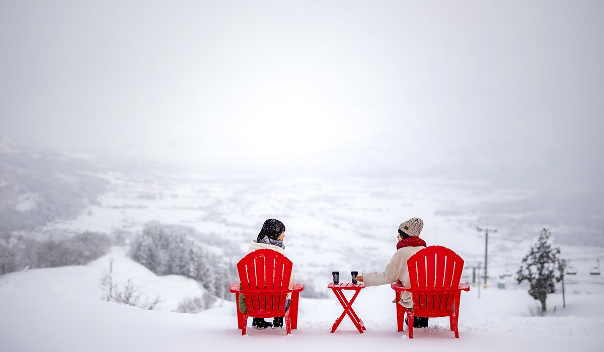 雪のテラスからは、真っ白に雪化粧をした魚沼平野と越後三山を望む大パノラマをお楽しみいただけます。