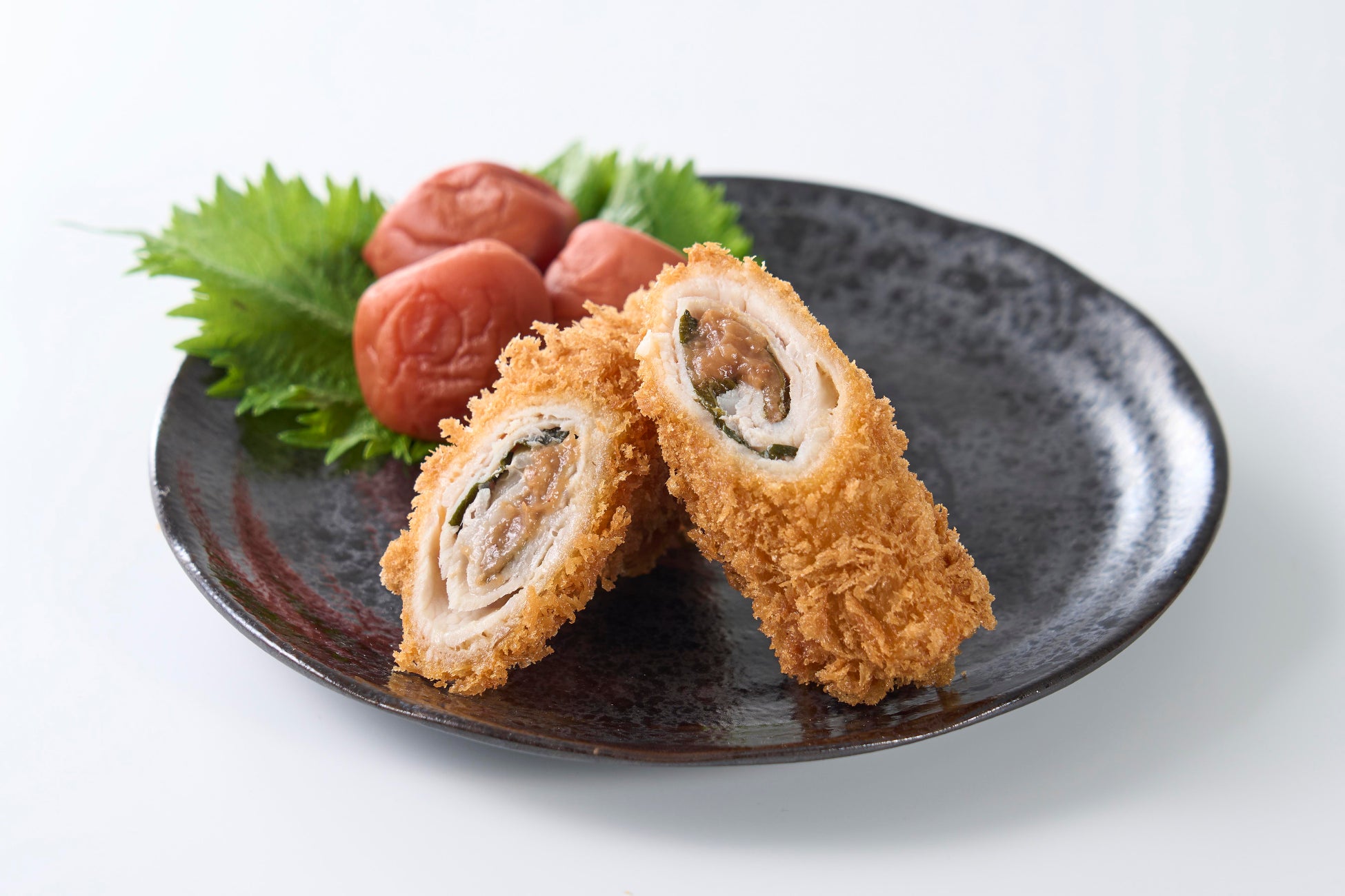 紀州産の梅肉と大葉を薄切りの豚ロース肉で巻いた期間限定のかつです。梅の酸味と大葉の香味で、暑い日でもさっぱり食べられると毎年ご好評いただいています。晩ごはんのおかずに、ビールやハイボールのおともに、ぜひお試しください。