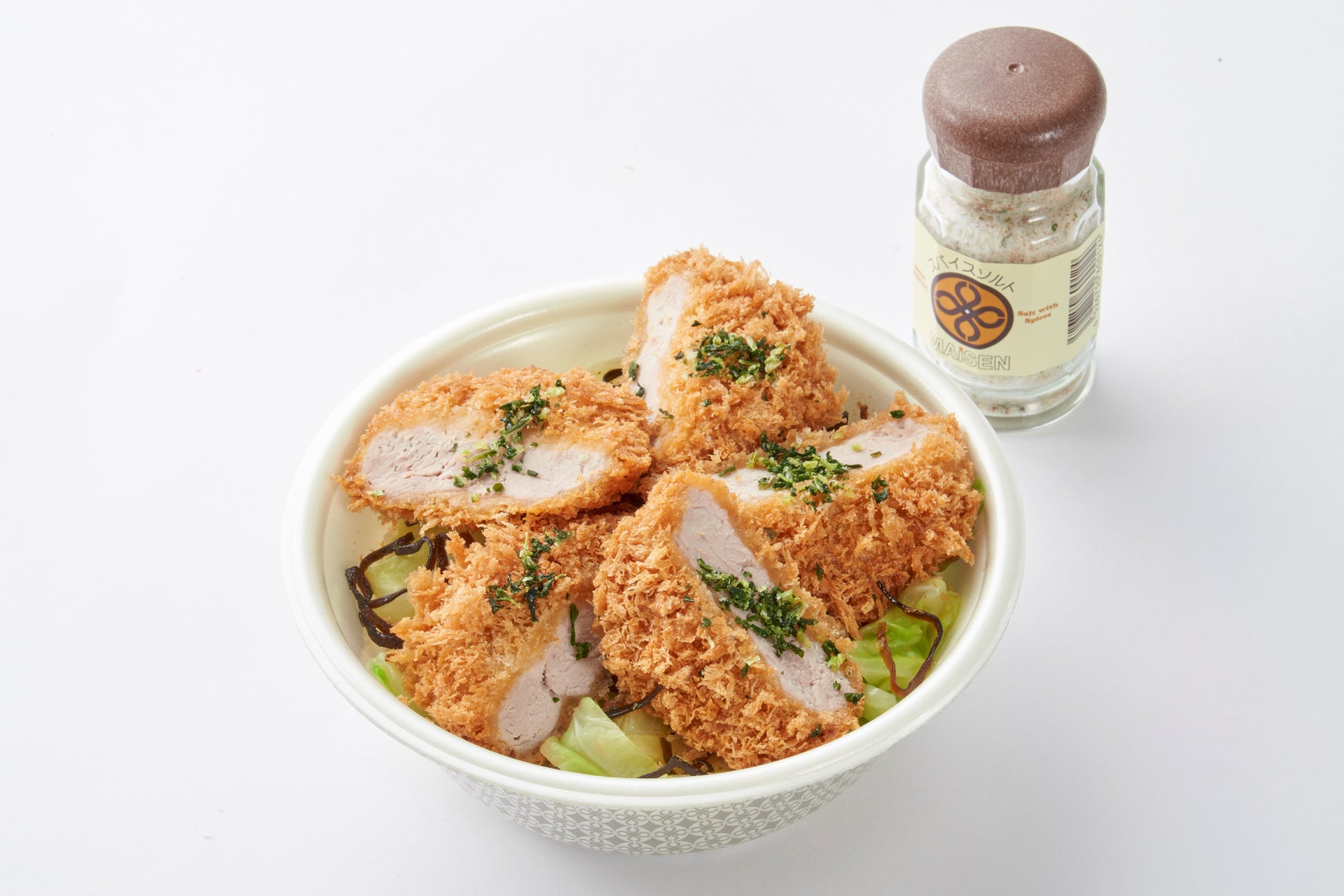 まい泉自慢のやわらかいヒレかつを卵でとじないで塩味で食べるかつ丼です。2012年に「さっぱり食べられるかつ丼」というコンセプトで開発し、毎年春から初夏にかけて期間限定で販売している人気商品。茹でた角切りキャベツと塩昆布をアクセントに、ヒレかつにまい泉オリジナルの「スパイスソルト」をふりかけて召し上がると食が進みます。
