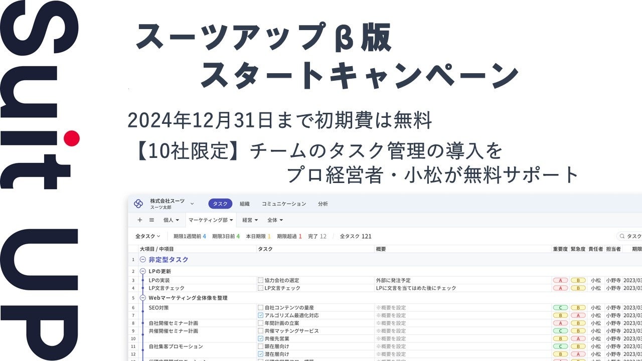 2024年4月22日から4月30日までにスーツアップの無料お試し30日にお申込みいただきましたお客様のうち10社限定で、当社代表者であり中小・中堅企業やスタートアップのバリューアップに実績のあるプロ経営者の小松自ら、チームのタスク管理の導入サポートを無料で行います。当該サポートをご希望の会社様は、当社のメールアドレス( info@suits.co.jp )まで、会社名、ご担当者名をご記入のうえご応募ください。カスタマーサクセス担当者からその後のご案内についてご返信をさせていただきます。