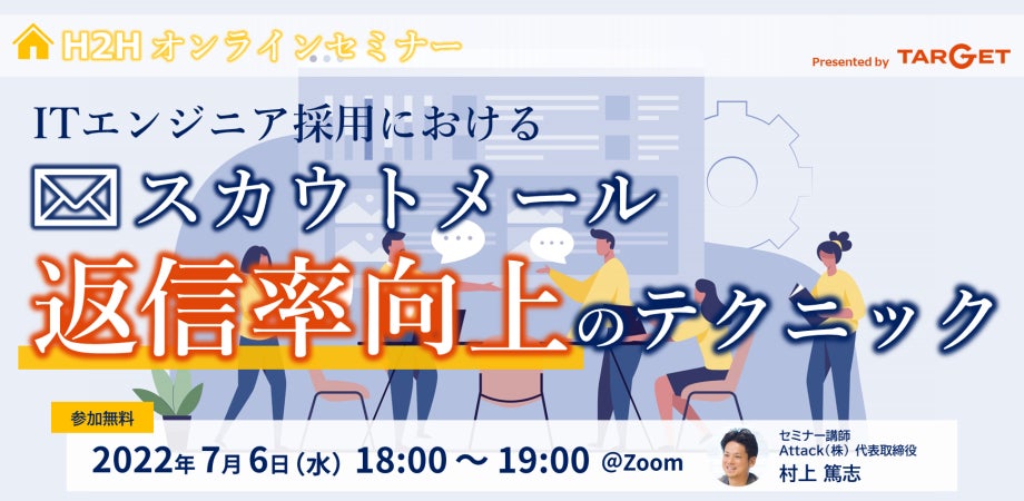 採用支援サービス『TARGET』などを展開するAttack株式会社(本社:東京都品川区、代表取締役:村上篤志)が経営者や採用責任者の方を対象とし、エンジニア採用におけるダイレクトリクルーティングに関する無料オンラインセミナーを2022年7月6日(水)に開催致します。