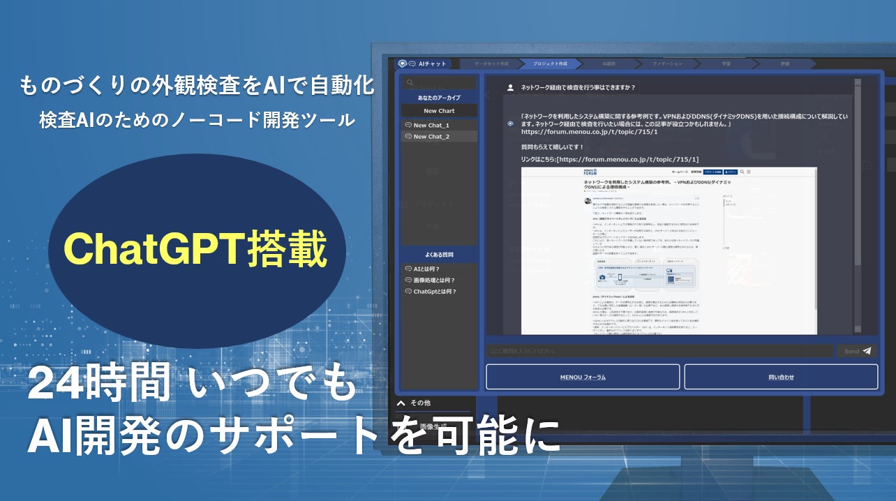 AIを用いた画像検査ソリューションを提供する株式会社MENOU(メノウ 本社:東京都中央区、代表取締役CEO:西本励照)は、「MENOU AI開発プラットフォーム」において、ユーザーの検査AIの開発をサポートする、ChatGPTを活用したチャット機能の提供を開始したことをお知らせします。