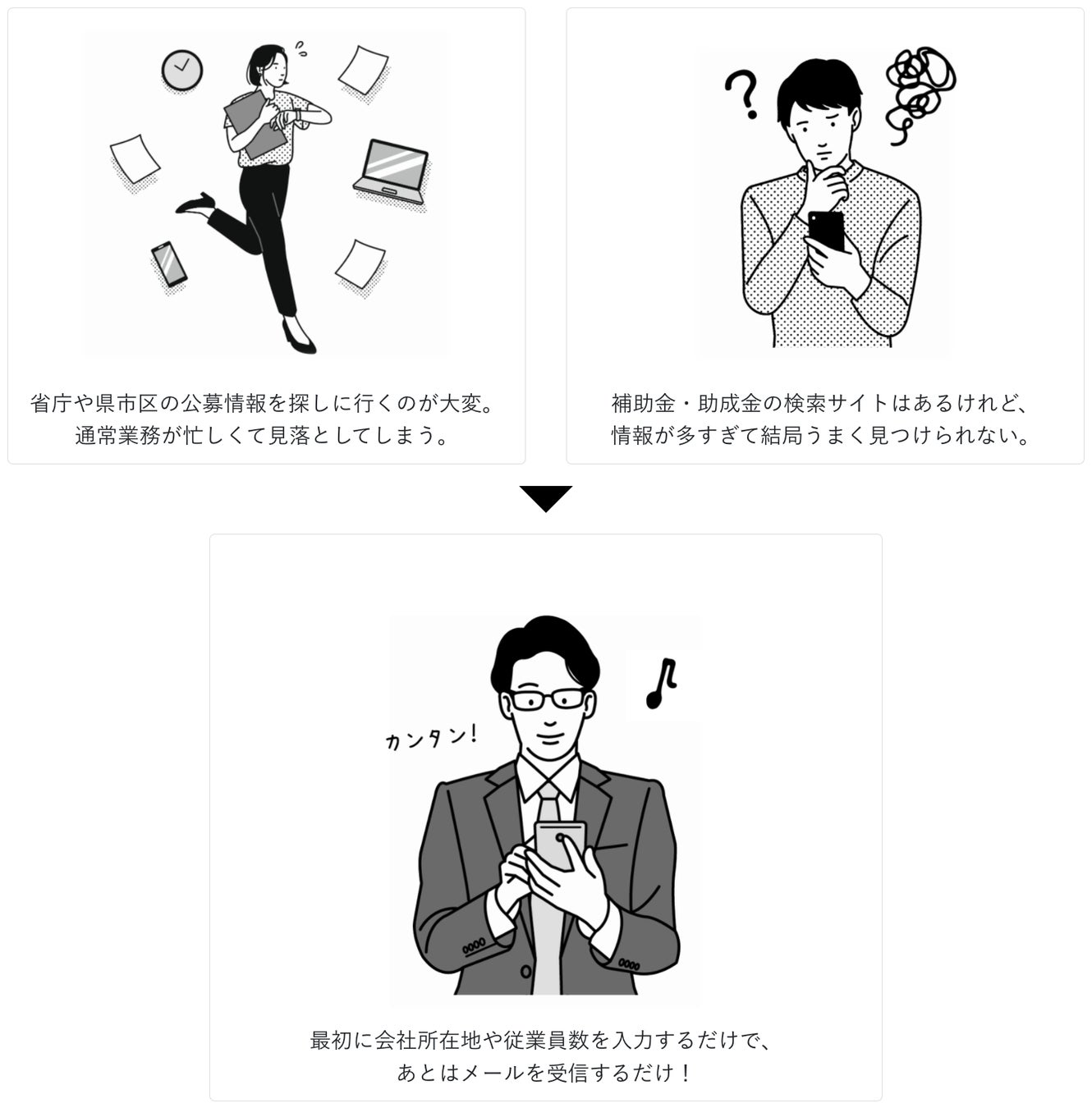そこで、忙しい中小企業の担当者でも、自社で使えそうな補助金・助成金の新着情報をキャッチアップできるよう、それらをメールで自動受信できるサービスを開発・提供開始するに至りました。
