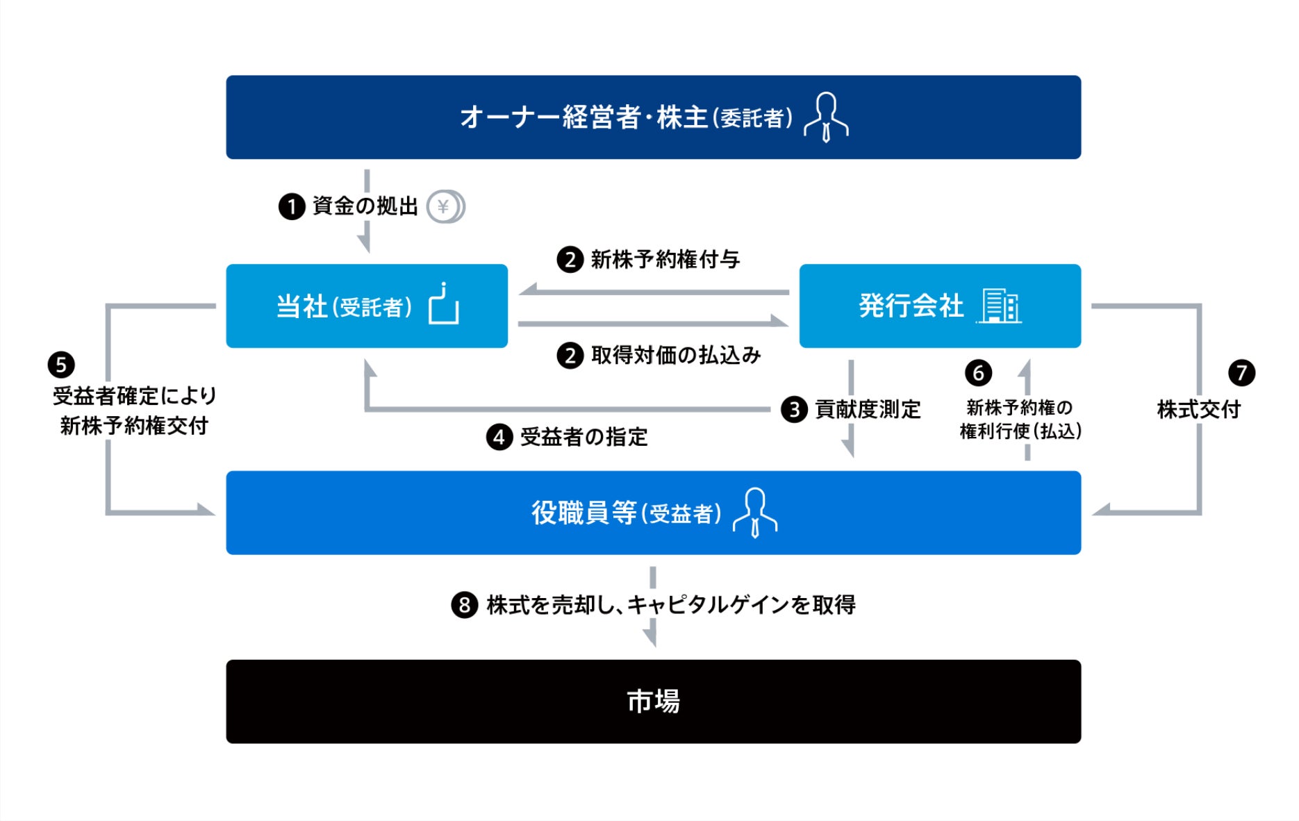1.委託者となるオーナー経営者・株主などがコタエル信託に対して資金を拠出し、コタエル信託が新株予約権を取得します。