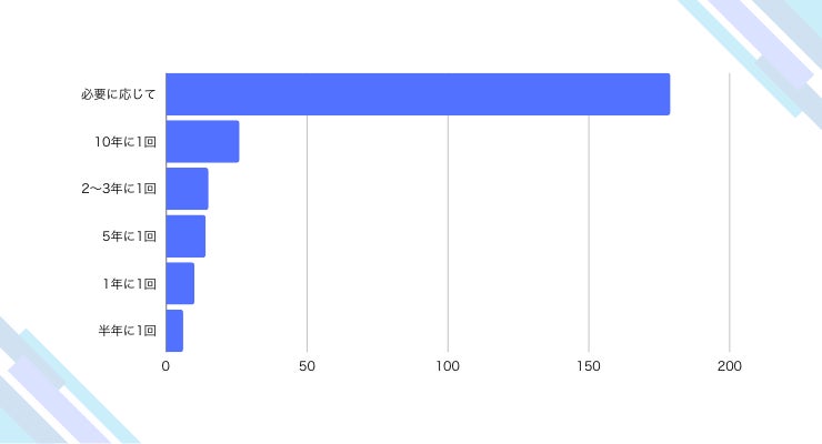 次いで、「どのようなメンテナンスを実施しましたか?(複数選択可)」(n=250)との問いでは、「外壁洗浄(136回答)」「外壁塗装(118回答)」が全体の70%を占めています。さらに、それぞれの頻度を尋ねたところ、下記の回答を得ました。