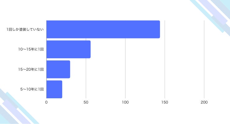 外壁塗装の頻度は、「1回しか塗装していない」「10~15年に1回」の合計が80%に達しました。主な理由として、外壁塗装は費用負担が大きく、外壁の耐用年数の目安が10~15年とされていることが考えられます。