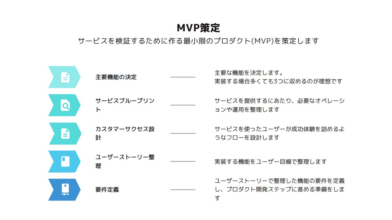 すべてのサービスに開発が必要という訳ではありませんが、顧客のニーズを満たす最小限のプロダクトのことを(MVP: MinimumViable Product)と呼び、まずはMVPを作ることで最小限のコストでサービスの検証をすることができます。
