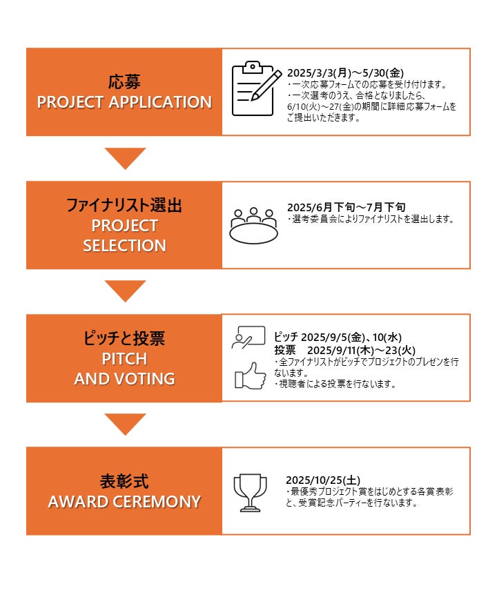 ・応募フォームと参考資料により、選考委員会を経てファイナリストを選出 ・ファイナリストによるピッチでのプレゼンテーションにより、視聴者投票で最優秀賞・優秀賞決定 |