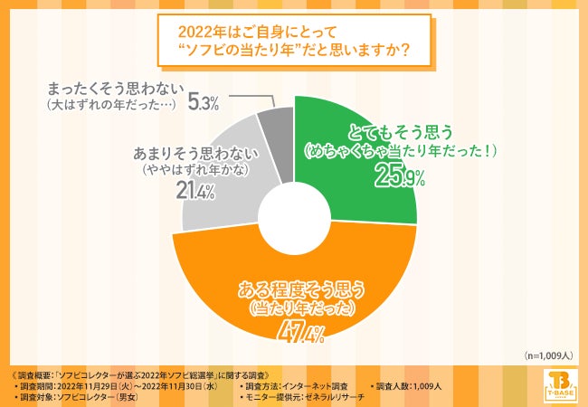 そこで、「2022年はご自身にとって“ソフビの当たり年”だと思いますか?」と質問したところ、『ある程度そう思う(当たり年だった)(47.4%)』と回答した方が最も多く、次いで『とてもそう思う(めちゃくちゃ当たり年だった!)(25.9%)』と続きました。