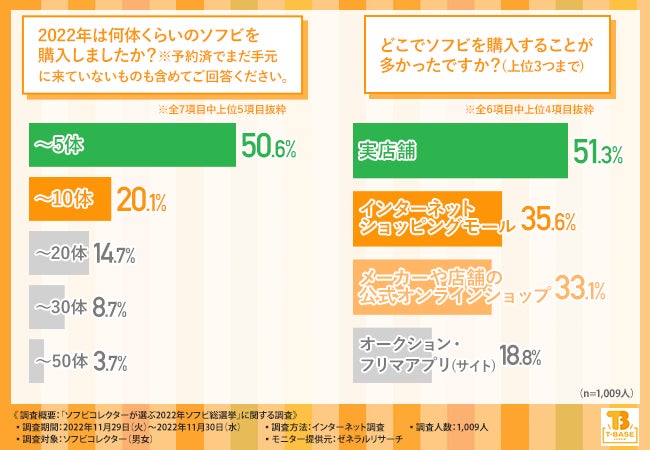 - 2022年のソフビ購入数は「5体」、購入先は「実店舗」が半数以上