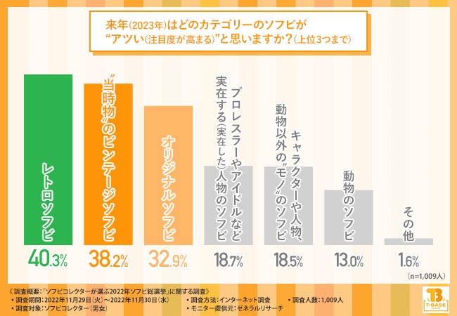 「来年(2023年)はどのカテゴリーのソフビが“アツい(注目度が高まる)”と思いますか?(複数回答可)」と質問したところ、『レトロソフビ(“レトロデフォルメ”と呼ばれるスタイルで作られたソフビ)(40.3%)』と回答した方が最も多く、次いで『“当時物”のビンテージソフビ(マルサン商会製、ポピー製など)(38.2%)』『オリジナルソフビ(作家さんによるインディーズソフビやショップ限定品など)(32.9%)』と続きました。