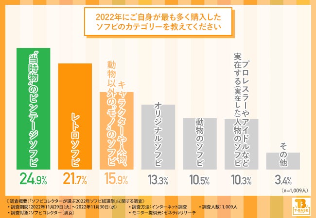 「2022年にご自身が最も多く購入したソフビのカテゴリーを教えてください」と質問したところ、『“当時物”のビンテージソフビ(マルサン商会製、ポピー製など)(24.9%)』と回答した方が最も多く、次いで『レトロソフビ(“レトロデフォルメ”と呼ばれるスタイルで作られたソフビ)(21.7%)』『キャラクターや人物、動物以外の“モノ”のソフビ(食品のソフビなど)(15.9%)』と続きました。