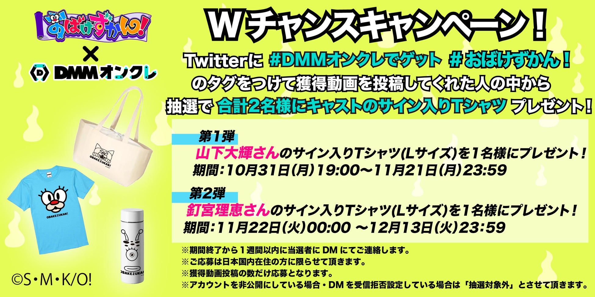キャンペーン開催期間中に「#DMMオンクレでゲット」「#おばけずかん!」のタグを付けて『おばけずかん!』グッズの獲得動画をTwitterに投稿した方には、抽選で各1名様にキャストのサイン入りTシャツをプレゼントします。ぜひご参加ください。