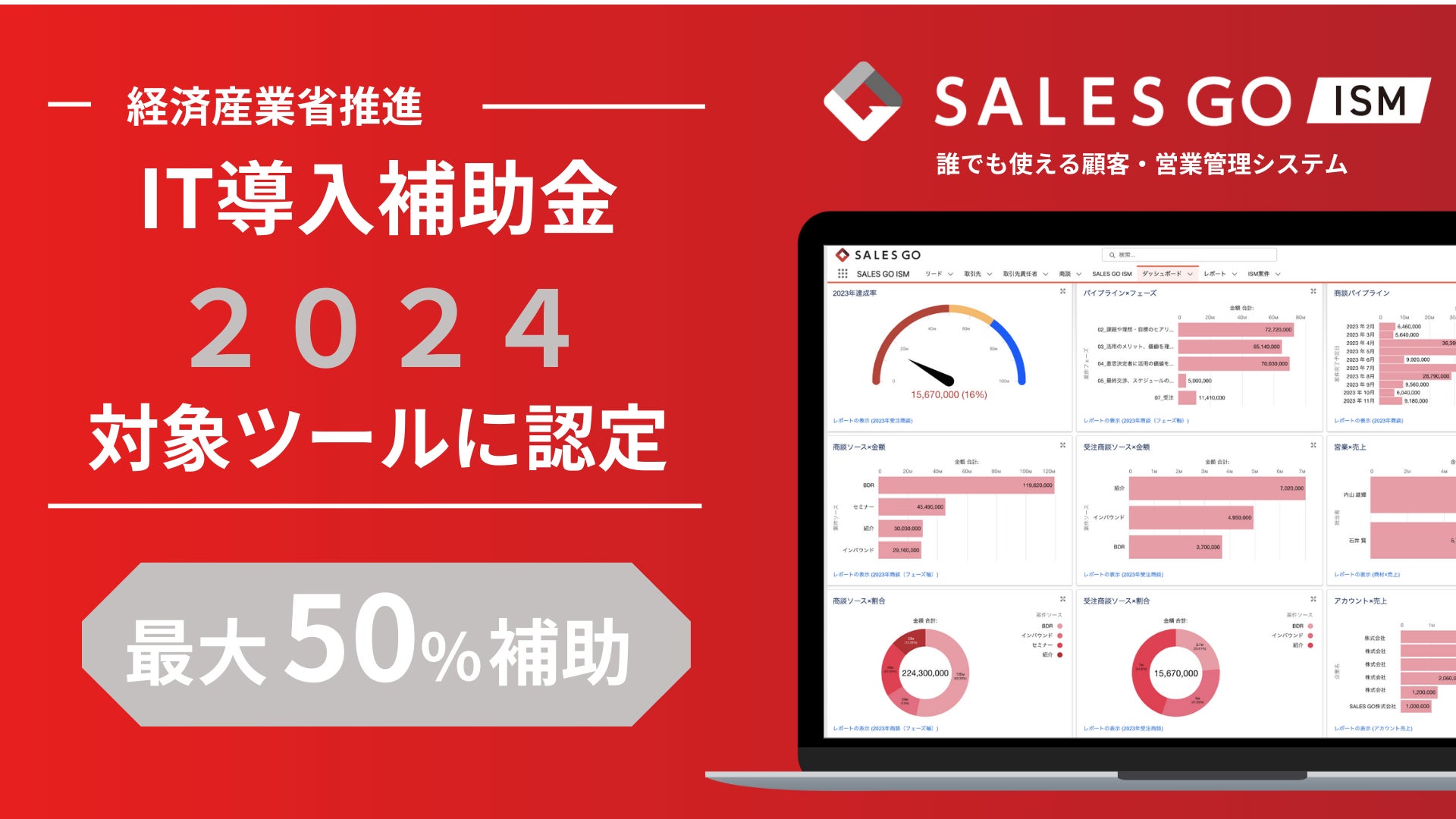 これにより「IT導入補助金2024」において補助対象となる中小企業・小規模事業者様が「SALES GO ISM」を導入する際に、初期費用・月額費用の最大50%、2年間で最大150万円の補助金を申請することが可能になりました。