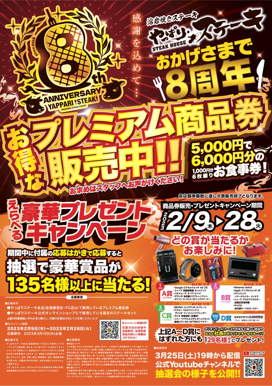 【やっぱりステーキがおかげさまで8周年!】お得なプレミアム商品券またはステーキ通販セットを買って応募できる豪華プレゼントキャンペーンを実施!!!