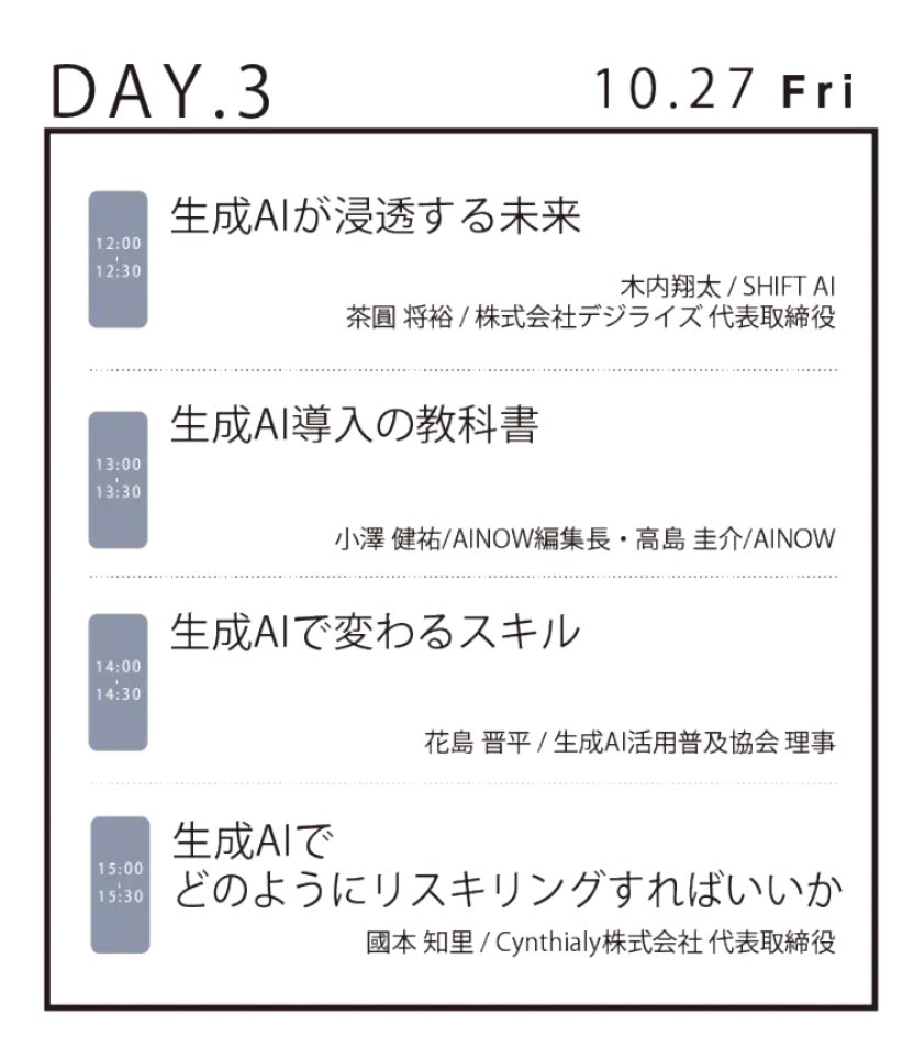 ディップが運営するAI専門メディア「AINOW」の編集長を務める、小澤 健祐をモデレーターに、数々のAI著名人をゲストにむかえ、生成AIの今について語る、DX時代のすべてのビジネスパーソンへ向けた生成AIの"今"がわかる3日間です!ぜひお気軽にお立ち寄りください。