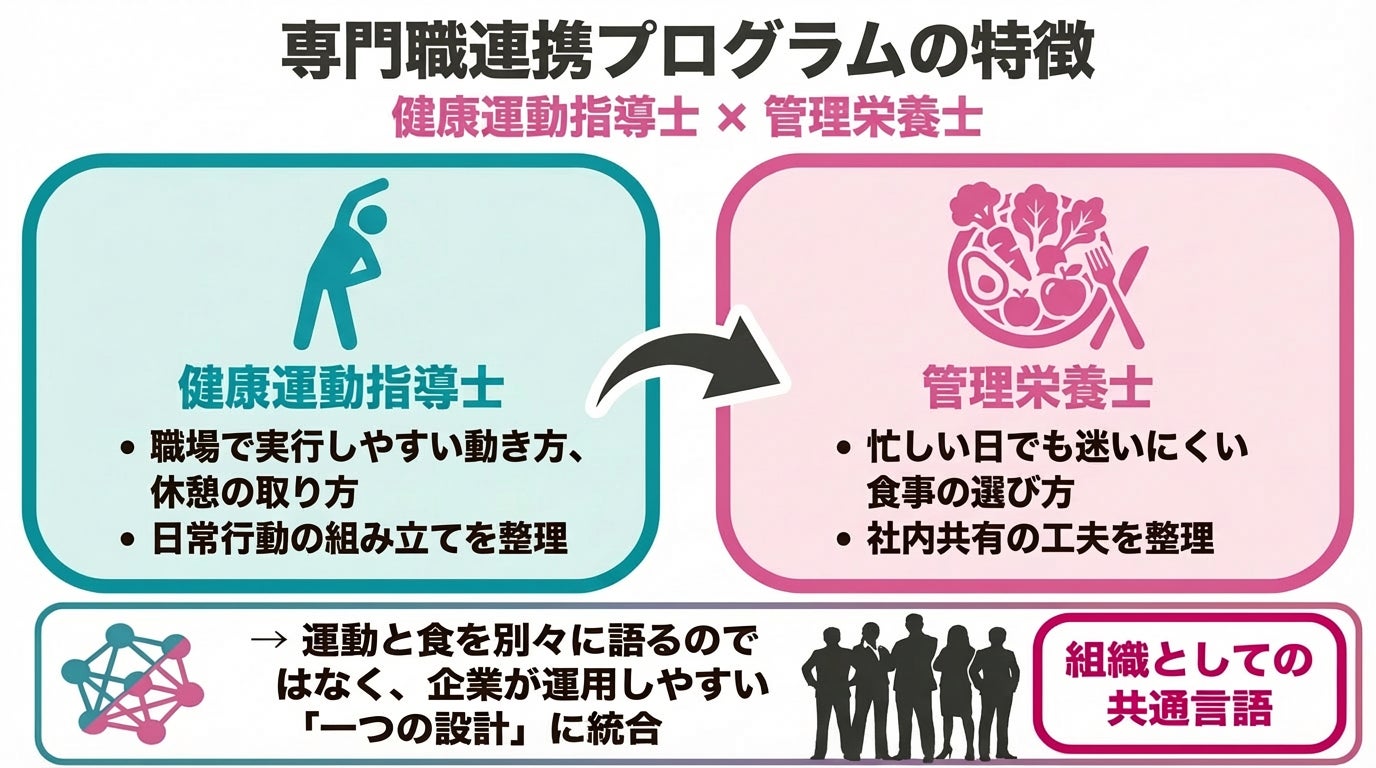 運動と食を別々に語るのではなく、企業が運用しやすい「一つの設計」として整える点が特徴です。