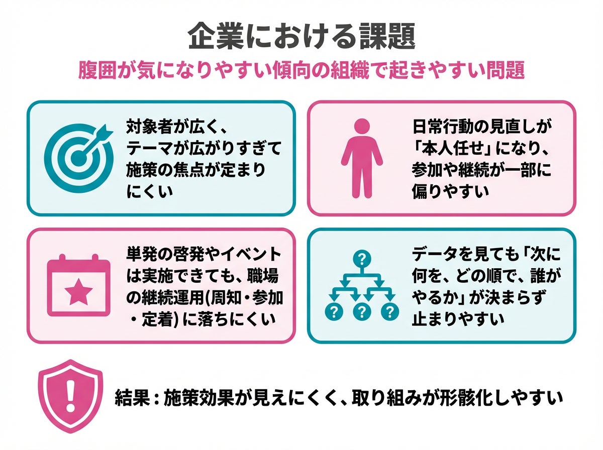 腹囲が気になりやすい傾向が見られる組織では、次のような主な課題が起きやすくなります。