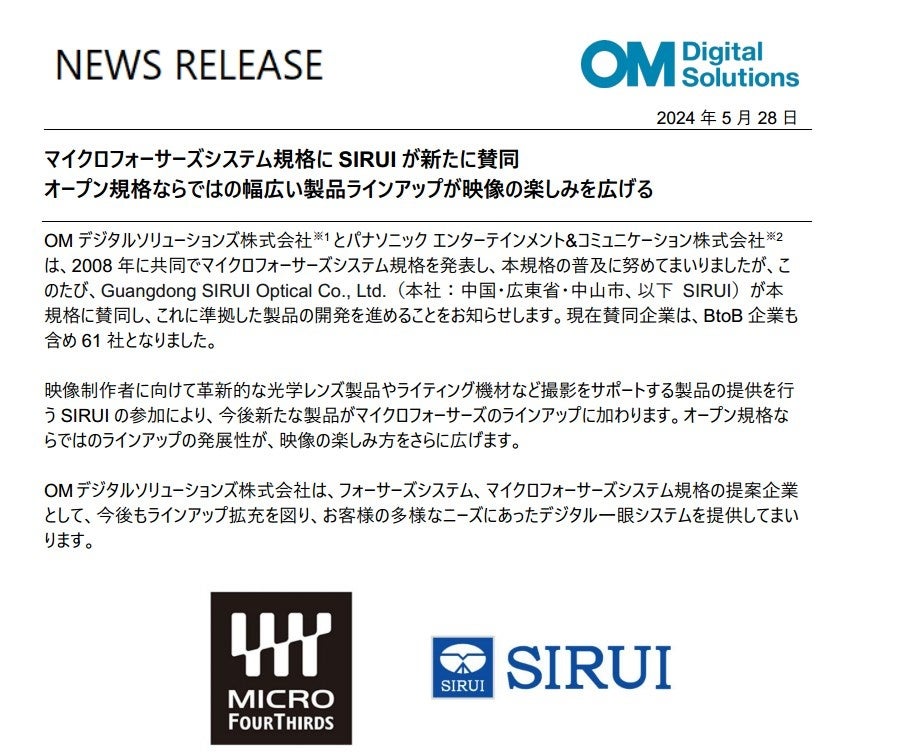 【朗報】5月28日、SIRUIがマイクロフォーサーズシステム規格の賛同企業になったことをお知らせします。