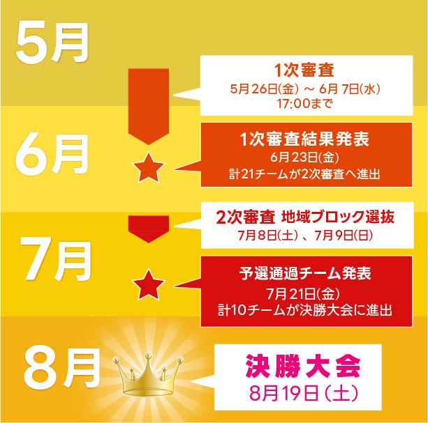 日程 | ・2023年5月26日(金)〜6月7日(水) ・2023年7月8日(土)・9日(日) 2次審査 地域ブロック選抜 ・2023年7月21日(金) 決勝大会進出チーム発表(10チーム) |