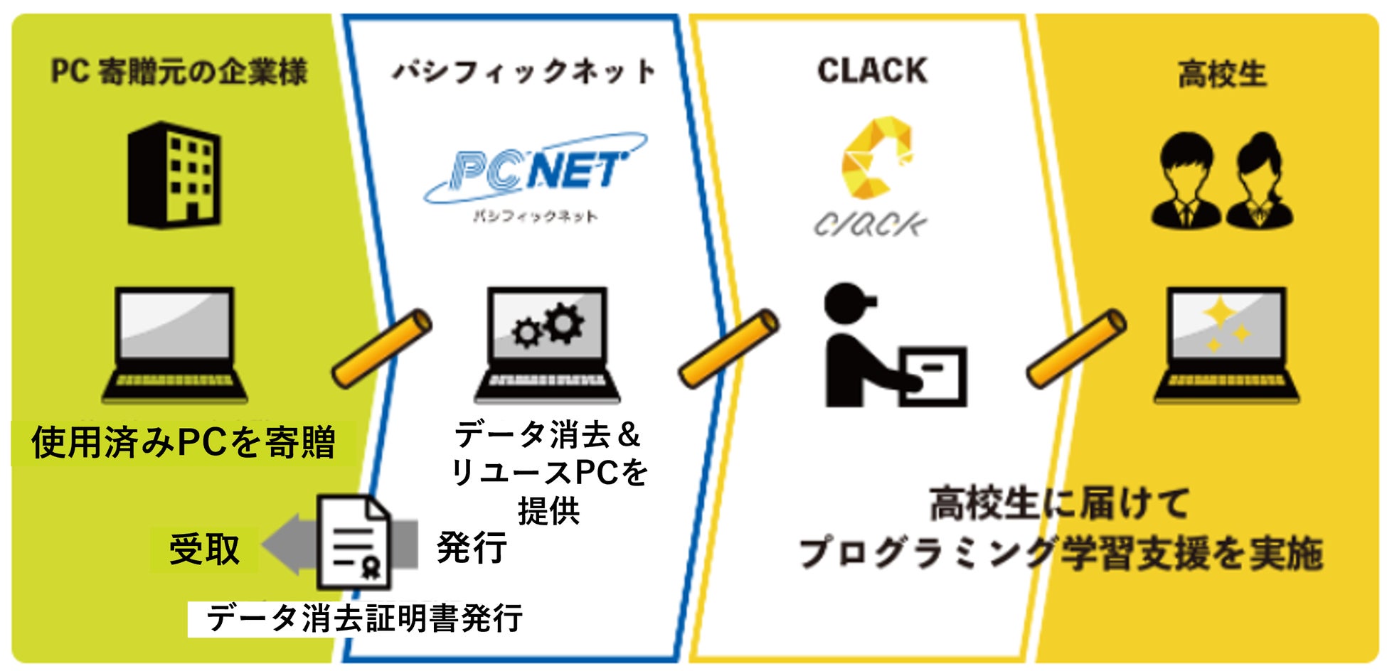 株式会社パシフィックネット(本社:東京都港区、代表取締役社長:上田 満弘、以下 当社)は、NPO法人CLACK(本社:大阪府大阪市、理事長:平井 大輝、以下 CLACK)が主導している使用済みPCの寄贈プロジェクト「Pass the Baton」のパートナー企業として、活動に取り組んでいます。