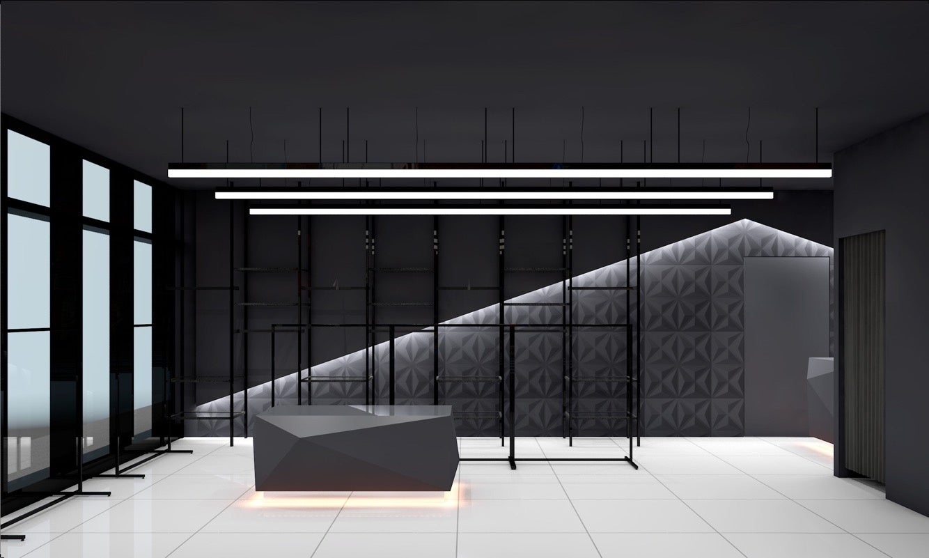 両店舗共に、CRONOSのブランドカラーであるモノトーンを基調とする洗練された高級感のある内装となっており、展開アイテムとしてはタウンウェアとしても着用できるスタイリッシュなデザインのアクティビティウエアを提案する「MENS」と「WOMENS」、高品質な縫製技術と伸縮性に富んだハイストレッチ素材を用いたシャツやジャケットを中心に展開するラグジュアリーライン「CRONOS BLACK」をラインアップ。「CRONOS福岡店」は、店内にディスプレイされた複数の什器に間接照明を採用し、ジオメトリック・パターンの立体パネルを壁に落とし込むことで、近未来的な空間を表現した店舗に仕上げました。
