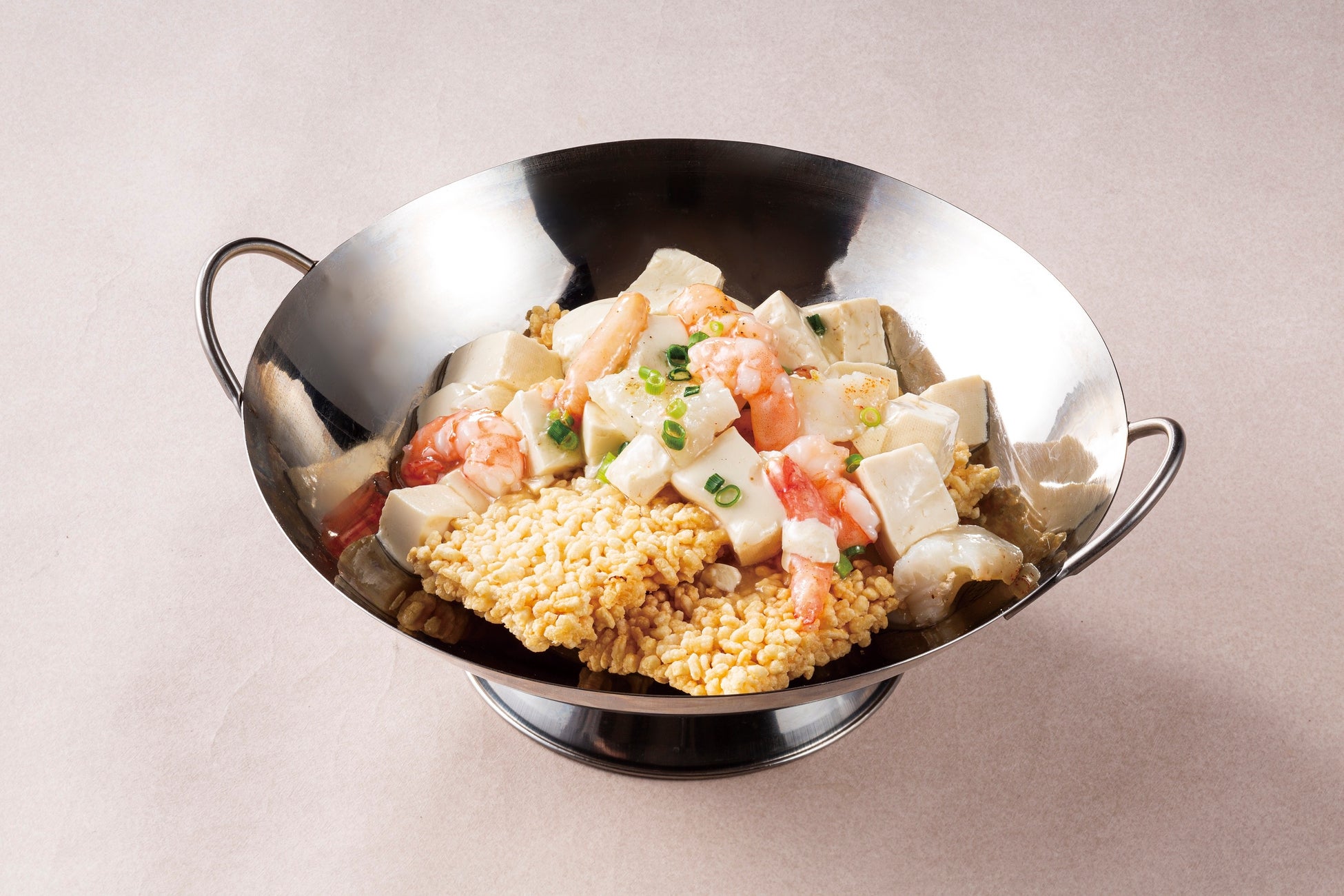 なめらかな木綿豆腐と海鮮を黄色唐辛子で煮込んだ、山椒油の香りと痺れが特徴の麻婆豆腐。熱々のおこげにかけたときの音と香り、 そして食感を愉しめる一品です。