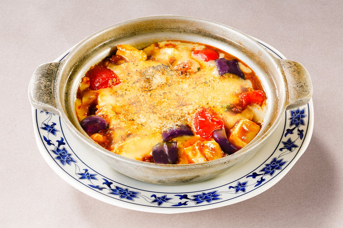 和牛を粗く叩きミンチにし、濃厚なコクとスパイス豊かなカレーの味わいが豆腐に染み込んだ贅沢な一品。茄子の旨味と爽やかな酸味のトマトにモッツアレラチーズが絡み、唐辛子の辛さをマイルドにします。 お好みで中華パンもどうぞ。