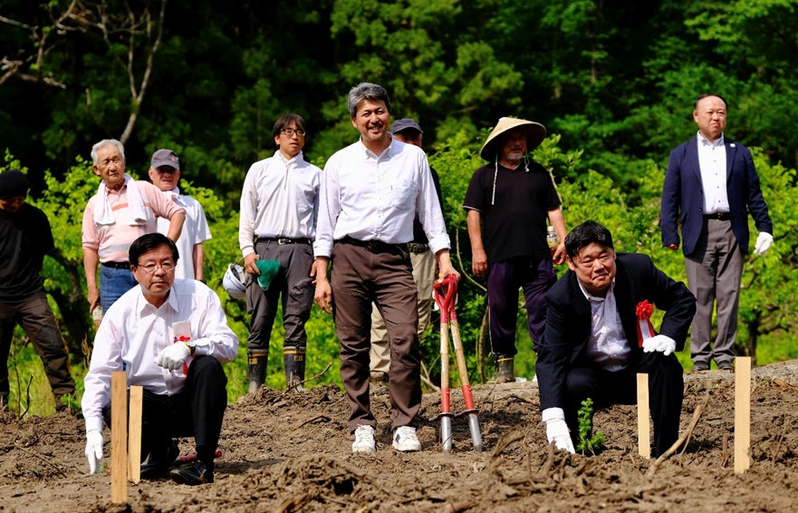 この嫋竹の地は、鶴ヶ城を眺める事ができた美しい場所でしたが、近年は手入れが行き届かず野生動物との境界が無くなってしまい、鳥獣被害などの緊急性の高い課題となっておりました。今回は、近くに会津藩士のお墓もあり、私たちはこの地を明るく美しくしなければならないという使命感と地域の方々の熱意に敬意を表し、採算性の合わない伐採業務を担う事としました。そんな中で「スマートレシート®」を活用した植樹のお話を頂き、実際にこのような盛大な植樹会を地域の方々と一緒に体験出来たことに感動しております。