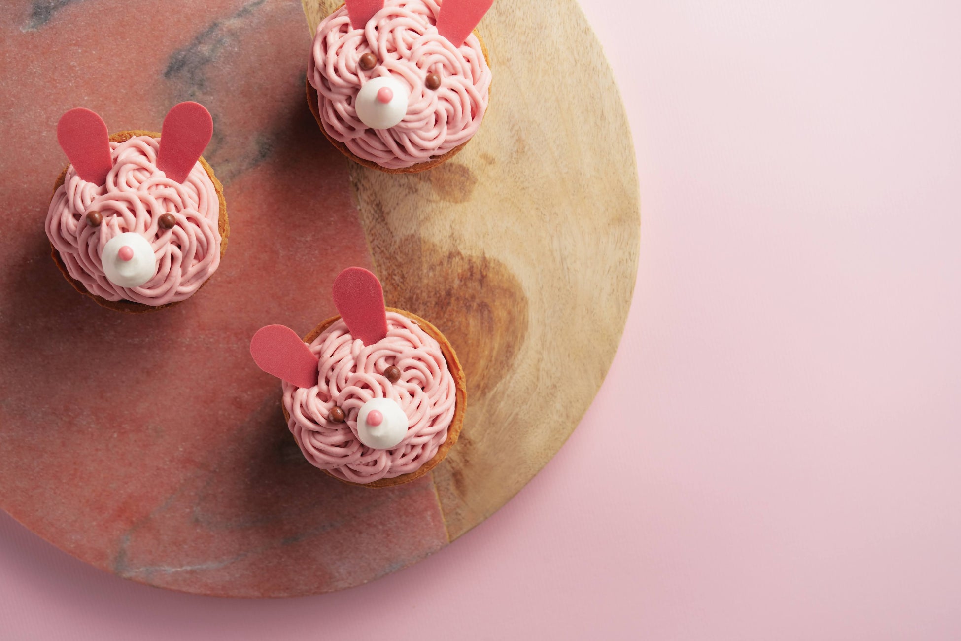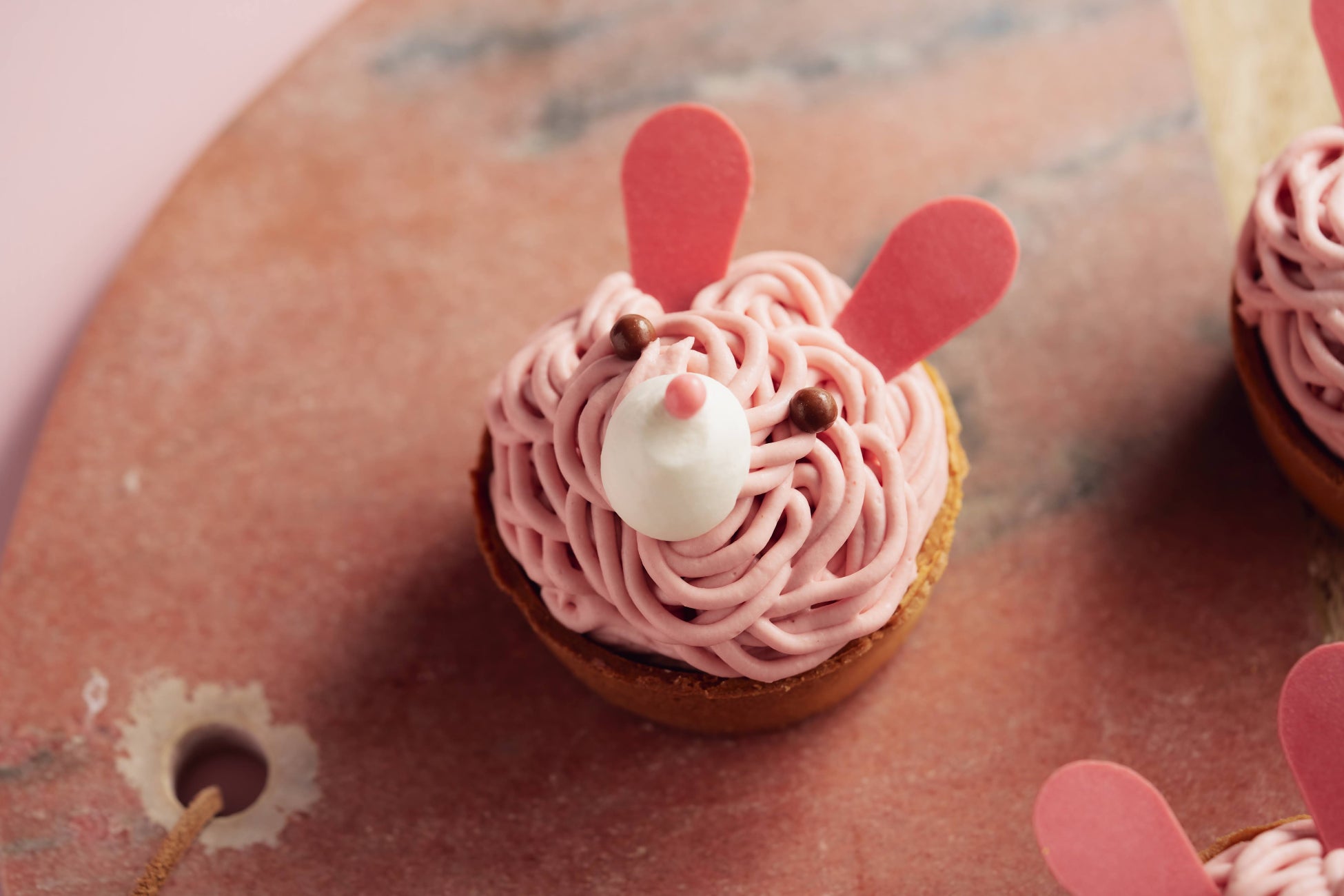 ピスタチオのクリーム、いちごのガナッシュクリームを絞り、可愛らしいうさぎのタルトに仕上げました。