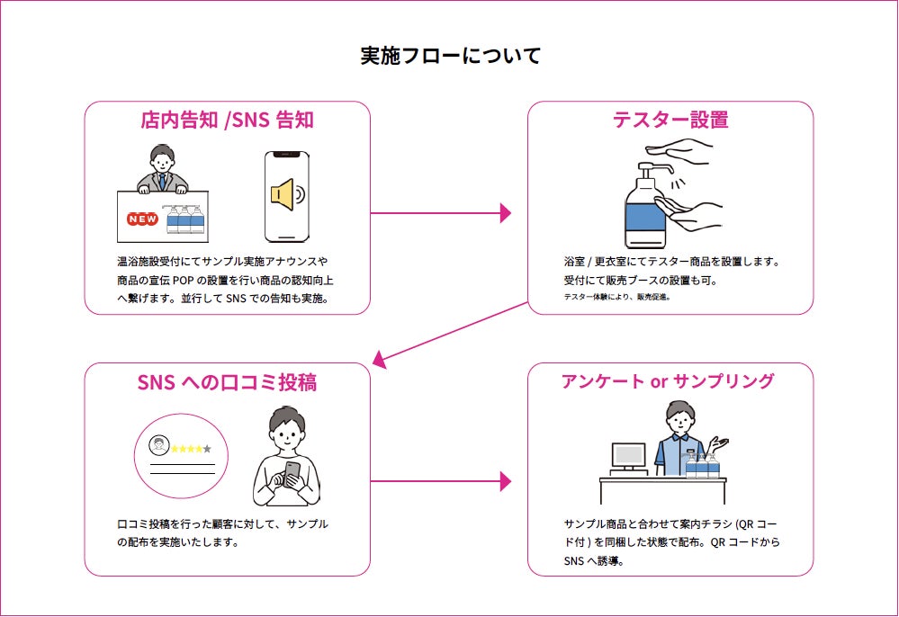 温浴施設を利用されるお客様に対して商品をリアルに体験いただき、認知拡大、販売促進へと繋げていくことができます。