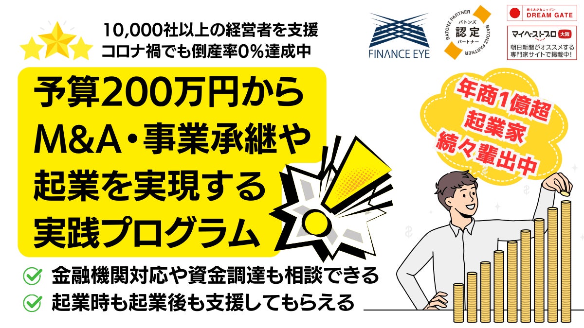 ファイナンスアイは、「1社でも多くの企業にファイナンスという活力を。継続的に成長していく支援をする事で、日本経済に貢献。」を理念に、起業家・個人事業主・中小企業の経営者に対し、成功報酬型で資金調達を支援しています。厳しい状況にある経営者にも積極的なサポートを行い、支援先はコロナ過にも負けず高い生存率を誇ります。ゼロゼロ融資による中小企業の倒産増加が顕在化してきた今、日本全国の経営者から毎日届く資金の悩み相談に対応し続けています。運営するWEBのオウンドメディアや各種SNSやLINE公式アカウントを通じて、大手金融機関出身者や財務コンサルタント、M&A支援機関のメンバーが監修した有益で視聴者や読者に分かりやすい情報を発信し続けています。サイトでは、融資が実現できる可能性を無料で診断するコンテンツも提供しており、毎日多くの経営者や起業家の皆様にご利用頂いています。ファイナンスアイでは資金調達だけではなく、経営者の様々な相談にも応じています。経済産業省中小企業庁のM&A支援機関登録制度にも登録済で、事業承継や小規模事業承継などによるM&Aの支援もしており、企業再生や経営改善といった困難な状況下で多くの経営者を支援してきた経験と知識を活かし、生存し続ける未来志向のサポートを提供しています。今回、日本最大級のM&Aプラットフォームである『BATONZ(バトンズ)』の認定パートナーとして活動を開始した事で、これまでの資金調達やファイナンスの支援にプラスして、中小企業の事業承継やスモールM&AやM&Aによる起業や個人のM&Aの支援を通通して、スタートアップの創出と育成、地方創生と日本経済の発展に寄与してまいります。